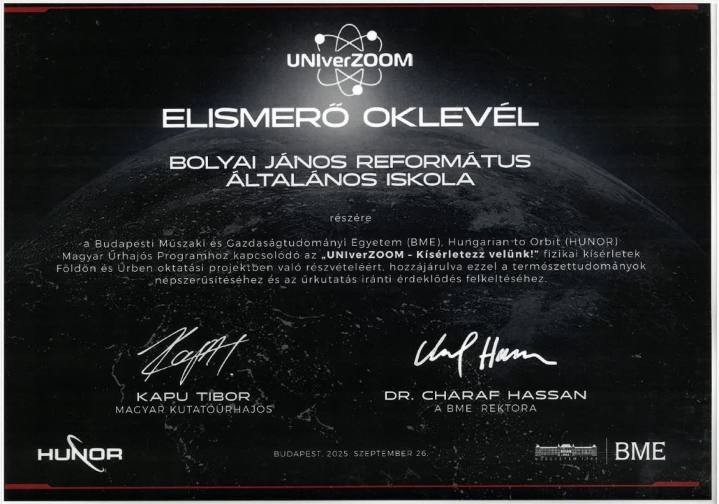 Intézményünk bekerült a BME és a HUNOR Magyar Űrhajós Program együttes szervezésében megvalósuló „UNIverZOOM – Kísérletezz velünk!” fizikai kísérletek Földön és Űrben című oktatási programba.